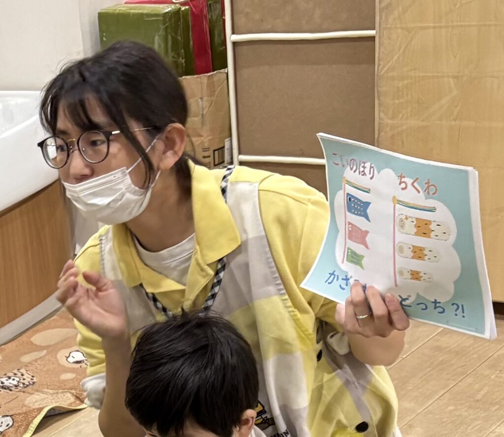 「鯉のぼりのちくわ、飾るのどーっちだ?」クイズに両方手を挙げているお友達もいましたよー!笑