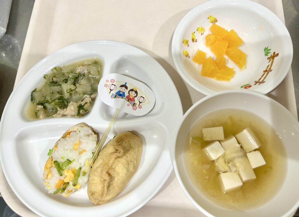 いなり寿司/大根と鶏肉の煮物/すまし汁/オレンジ