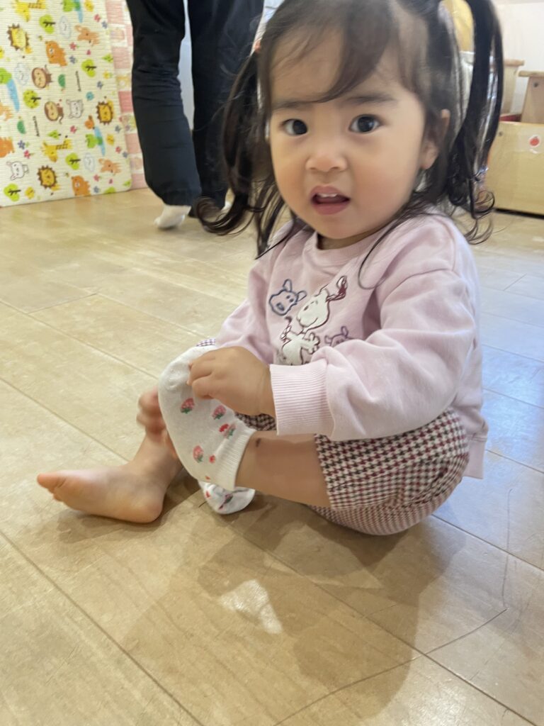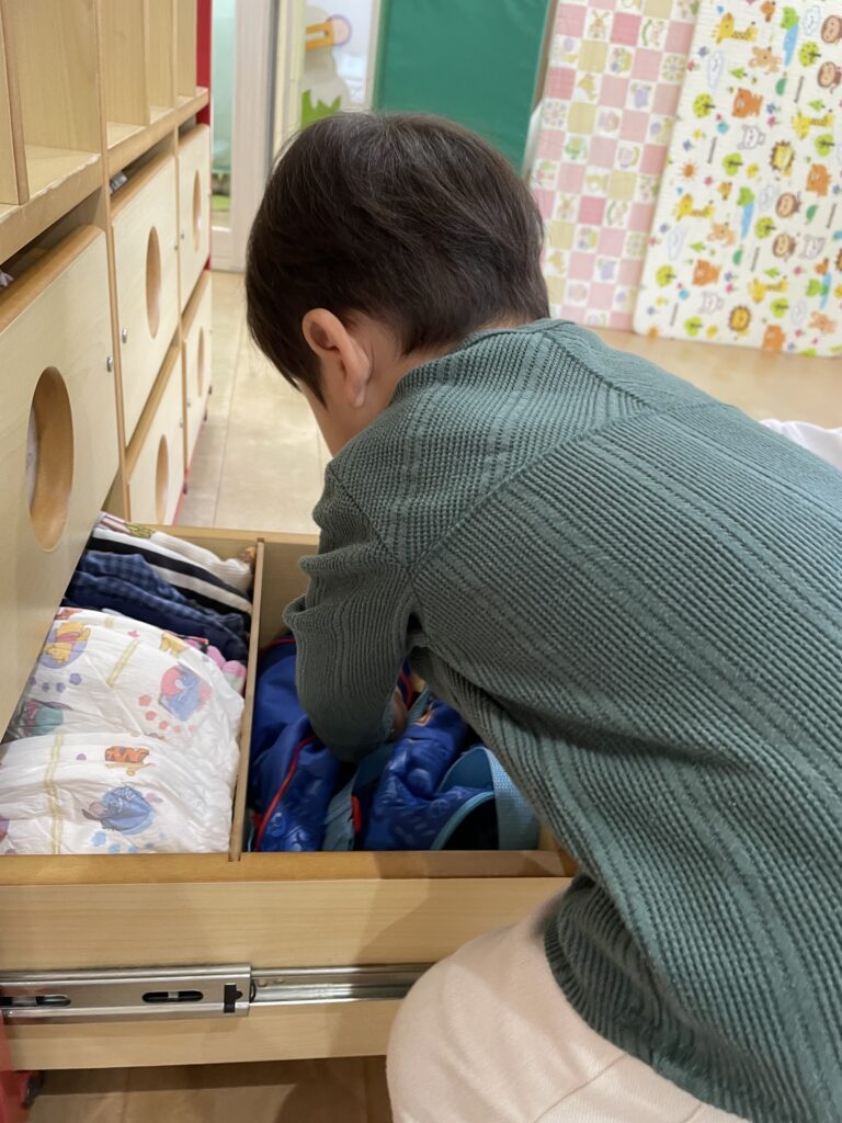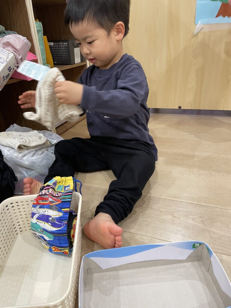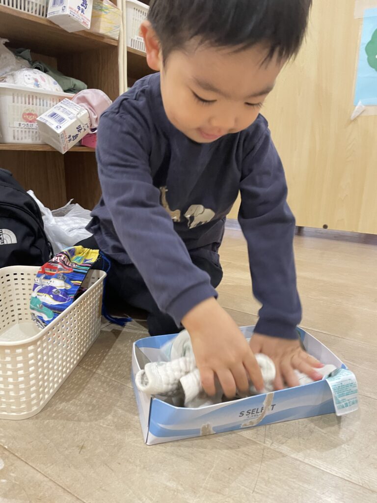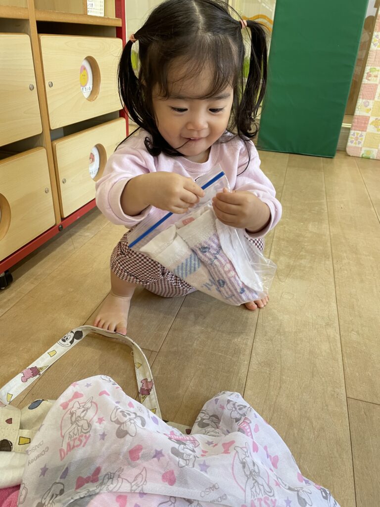うさぎ組さんのお友達も自分でご用意をしてくれます!ちゃんと自分のマークを見て、ロッカーの中に入れることができます!靴下も最初は、上手に脱げなくて苦戦していましたが今は、上手に自分で脱げる子が増えて来ました。