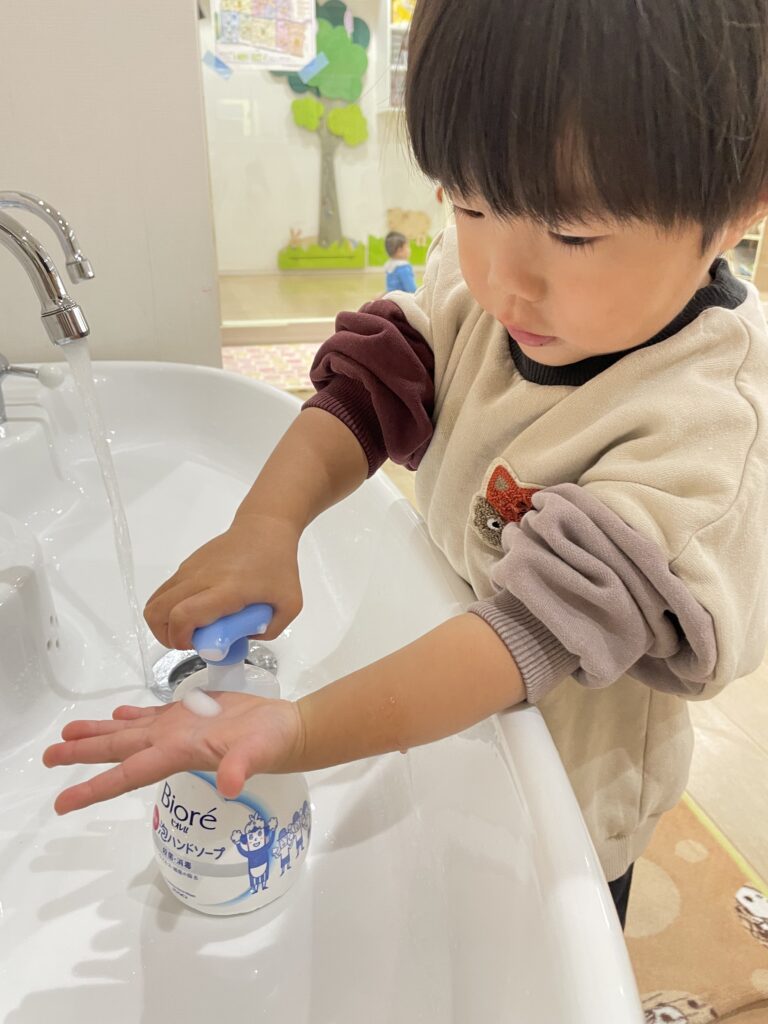 ご用意が出来たら手を拭くタオルをかけて、お袖を上げて泡で上手に手を洗います!うさぎ組さんもぱんだ組さんもとっても上手にできるようになりました😊そんな朝のご用意の様子をご紹介しました😊