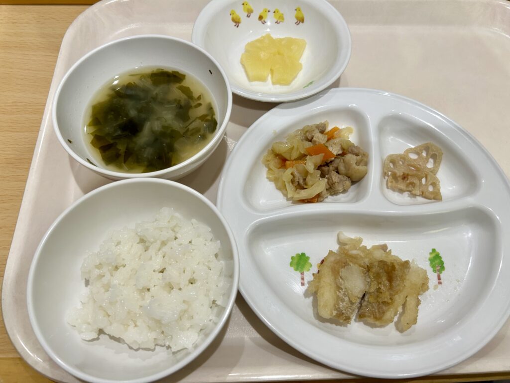 白糸タラとれんこんの甘辛揚げ/鶏肉とキャベツの煮物/みそ汁/パイン缶