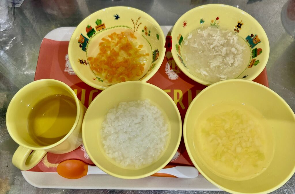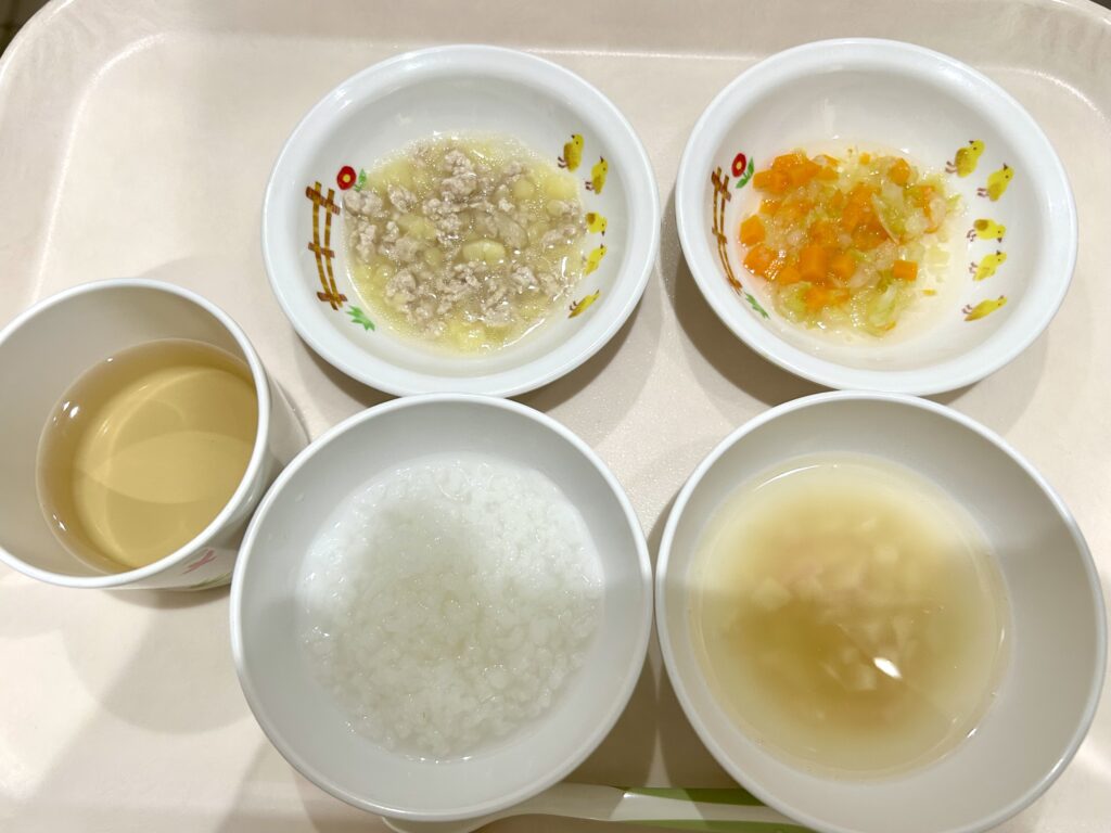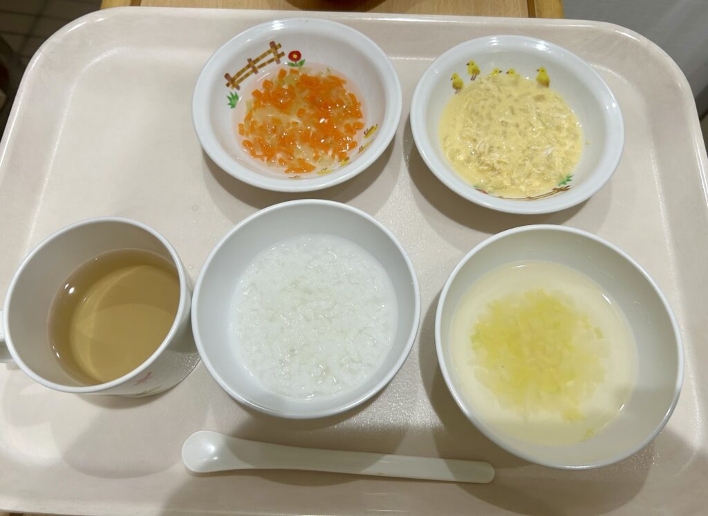 7分がゆ/鶏肉と野菜の玉子とじ煮(下は卵除去・アレルギー食)/人参ときゅうりのサラダ/みそ汁