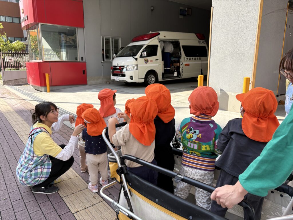 消防車と救急車が丁度帰ってきて、みんな大喜び♪消防士さんが、赤色灯をピカピカさせてくれて、みんな見入ってました✨