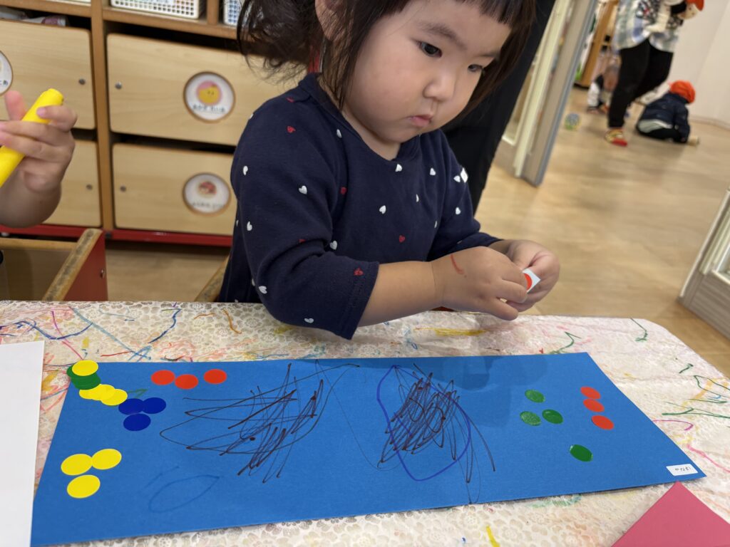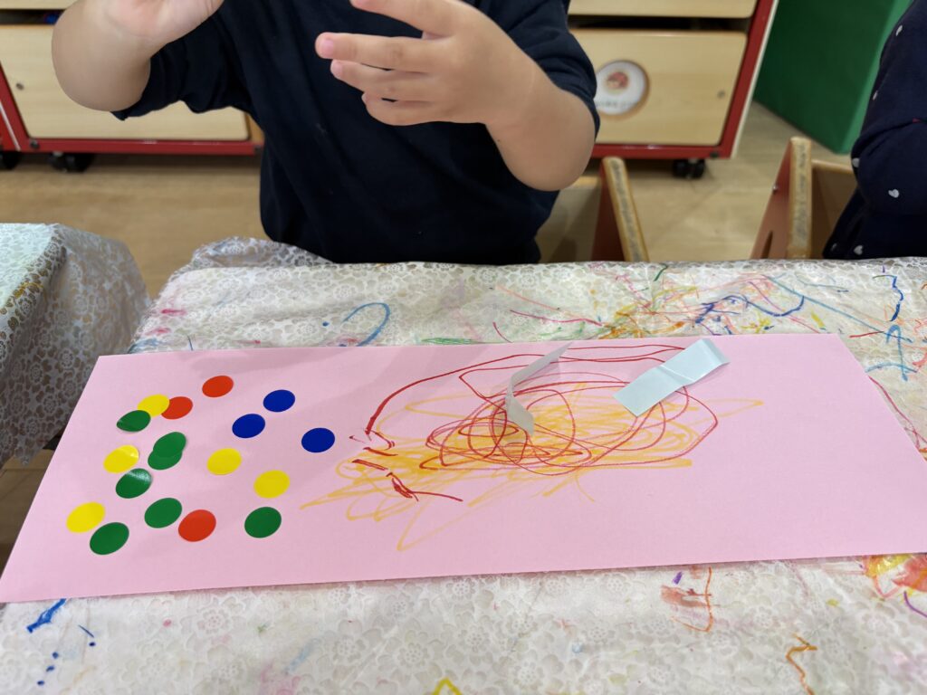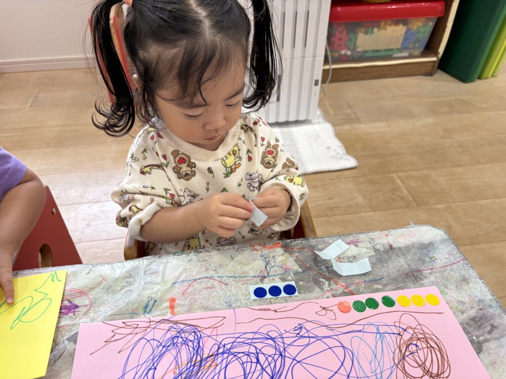 シール貼りは、色ごとに並べて貼るお友達や、シールばかりまとめて貼るお友達、それぞれでしたがみんな集中して貼っていましたよ!