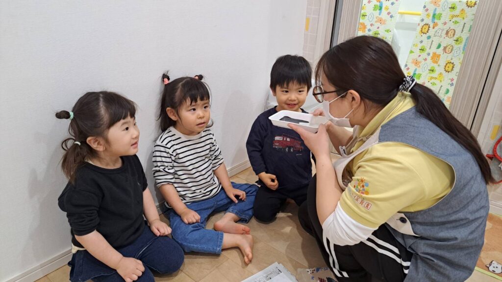 「何するのー!」とワクワクして待つ子どもたち。見本として書いた『午』を見せると興味津々でした✨
