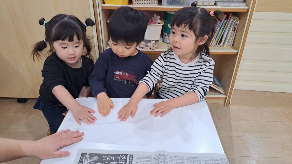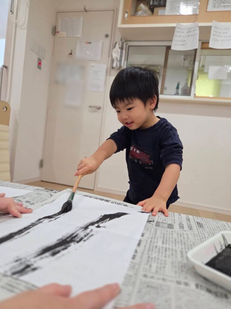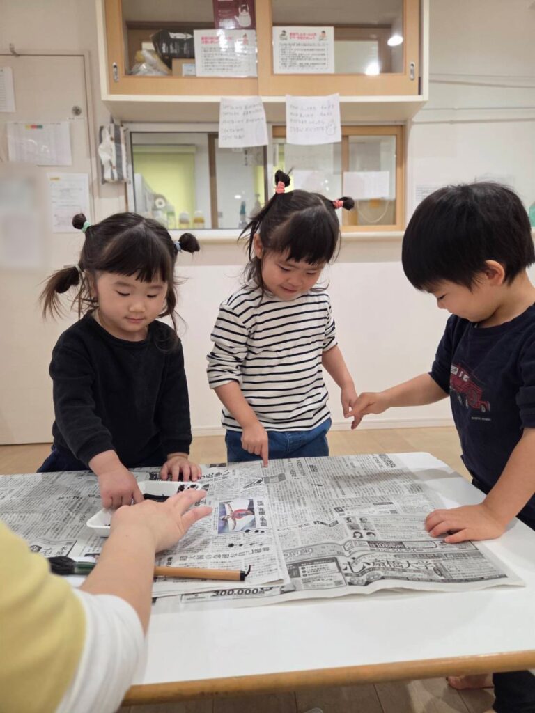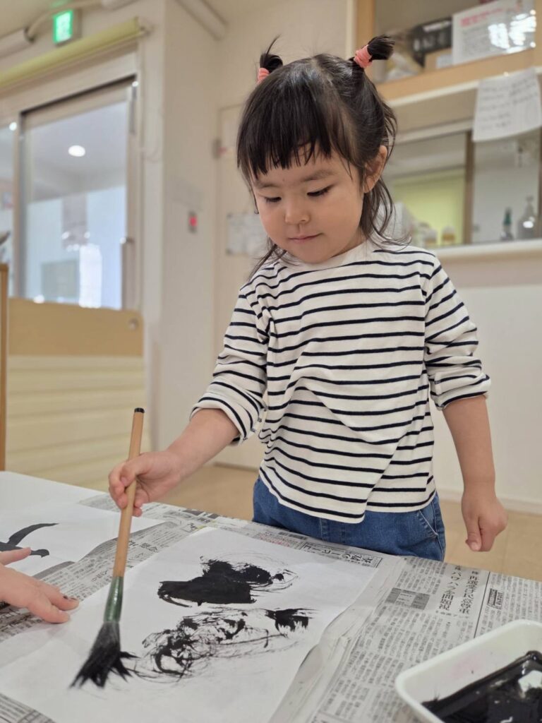 最後には指に墨汁をつけて新聞紙にスタンプ!手が汚れるのが苦手な子も石けんで落ちることを知ると目を輝かせて触っていました( ¨̮ )