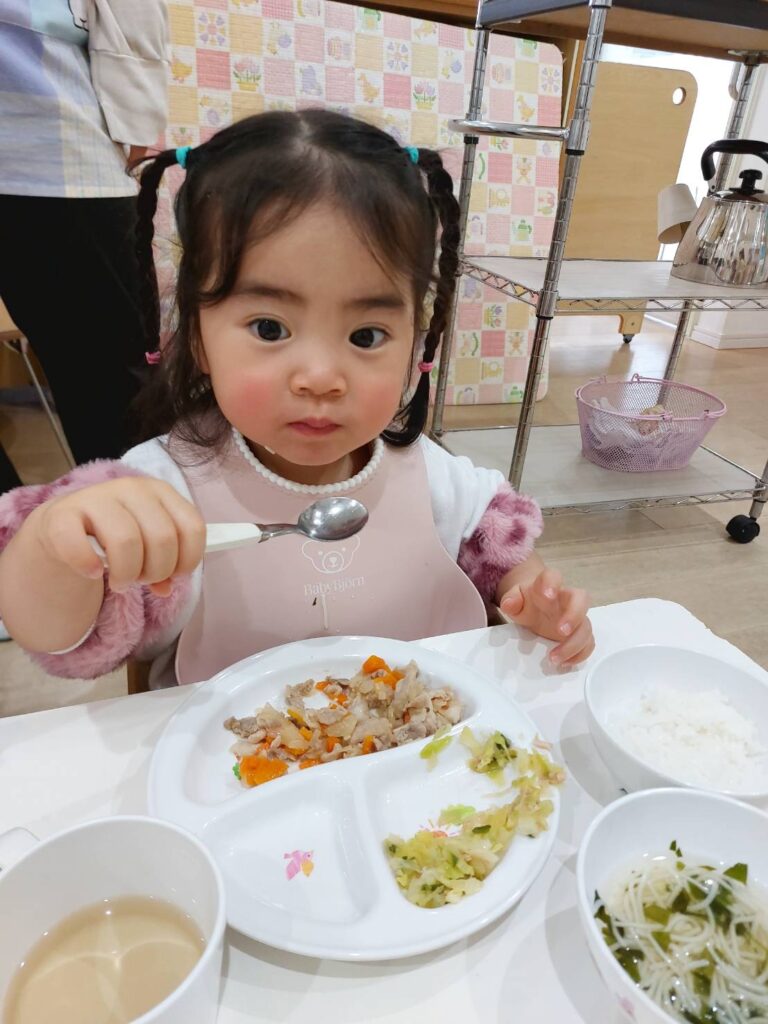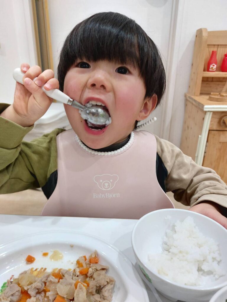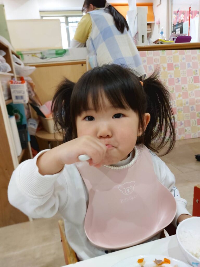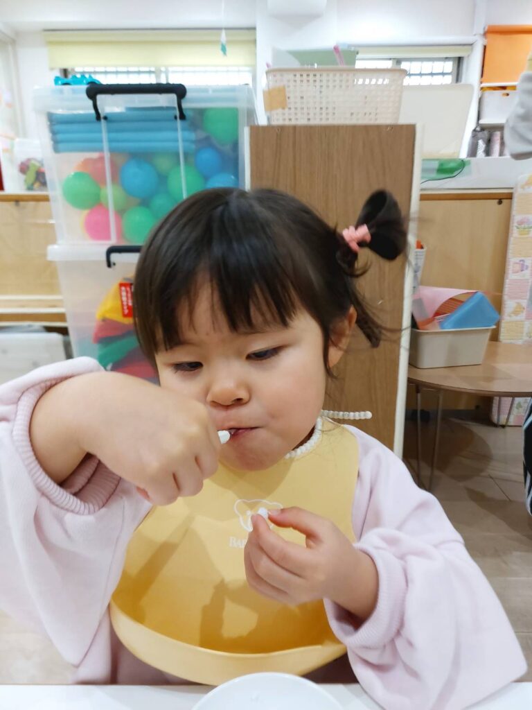 うさぎぐみ、ぱんだぐみのお友だちは、スプーンですくってパクリ✨✨と上手に食べていますよ。