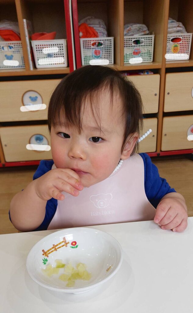ひよこぐみのお友だちは食べ物に興味を持って、ツンツンと触ってみたり、手づかみで感触を感じながらやスプーンを持ったりして食べ物に興味も持って食べています。