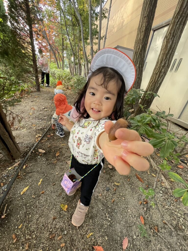 見つけたどんぐりを保育者に「みてー!」と元気いっぱいに見せてくれました!