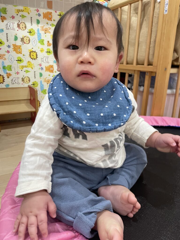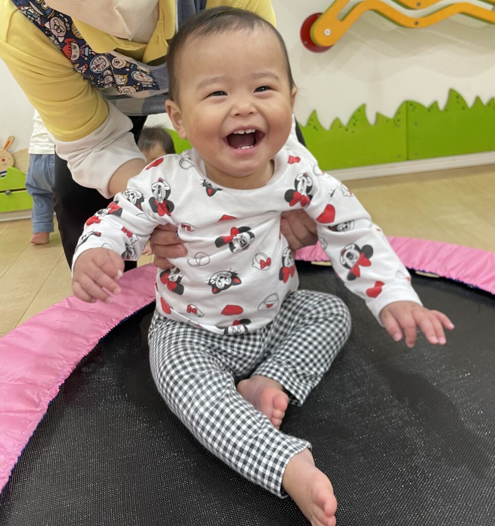 保育者が抱っこして跳ねてみると満面の笑みで楽しんでいました☺️