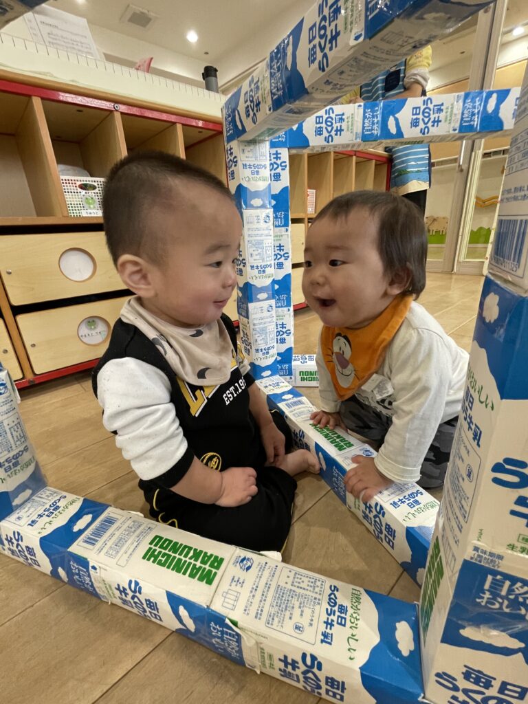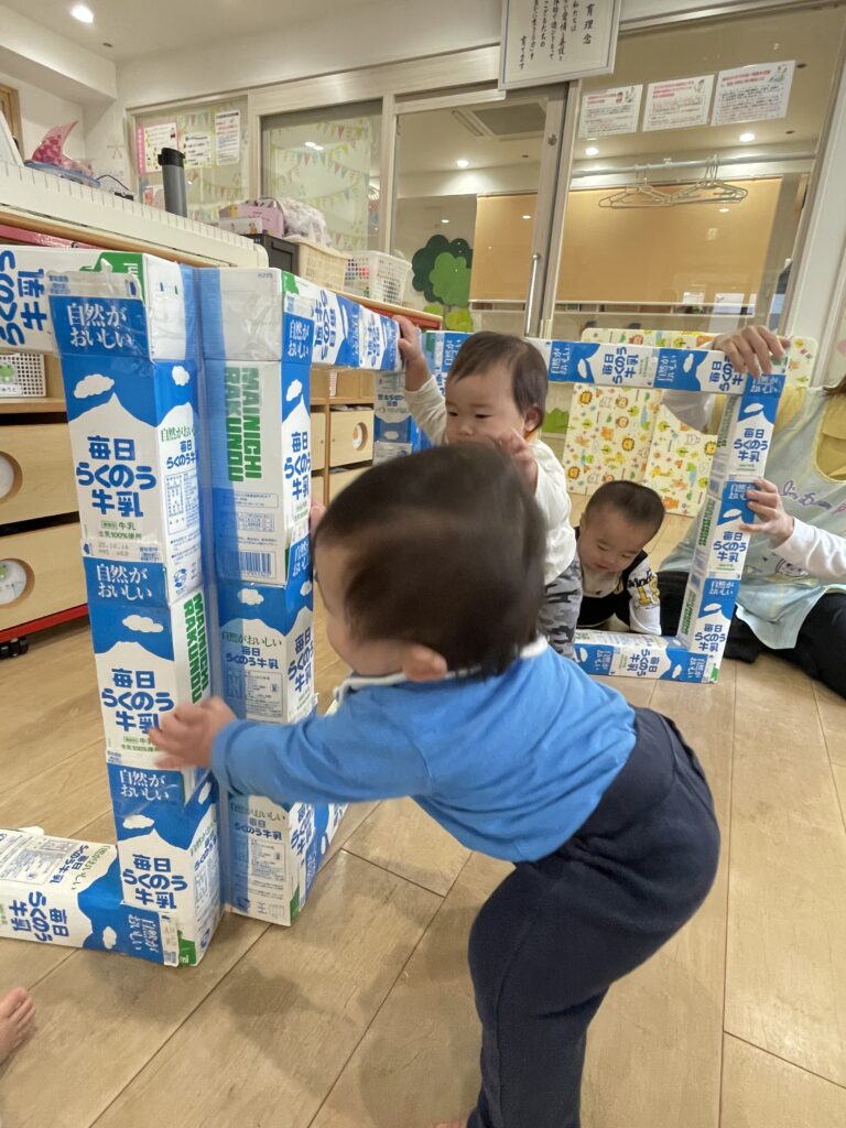 近所の亀までお散歩に行ったあと、室内で牛乳パックのトンネルで遊びました!