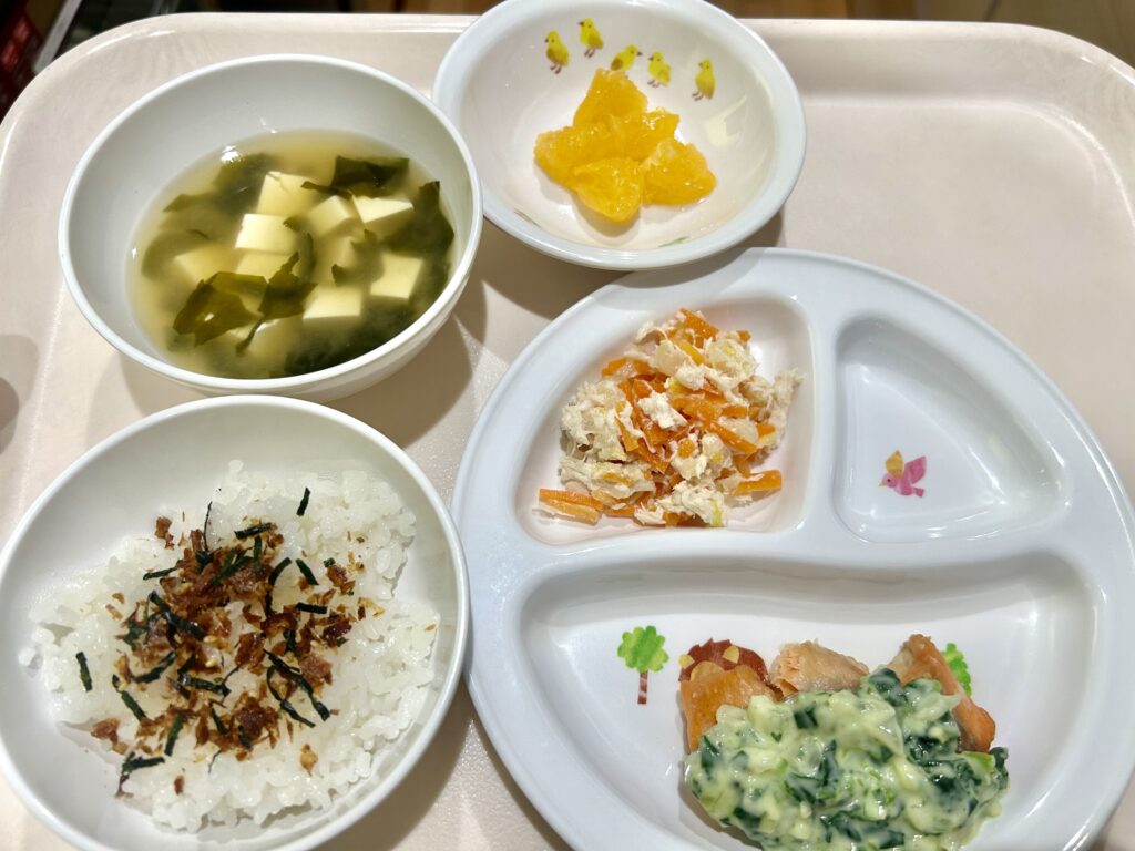 ふりかけご飯/鮭のほうれん草クリームソース/鶏ささみと白菜のサラダ/みそ汁/いよかん
