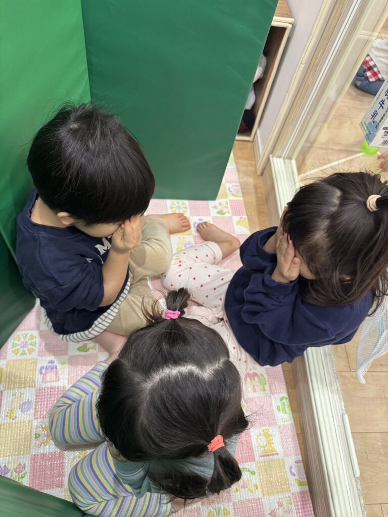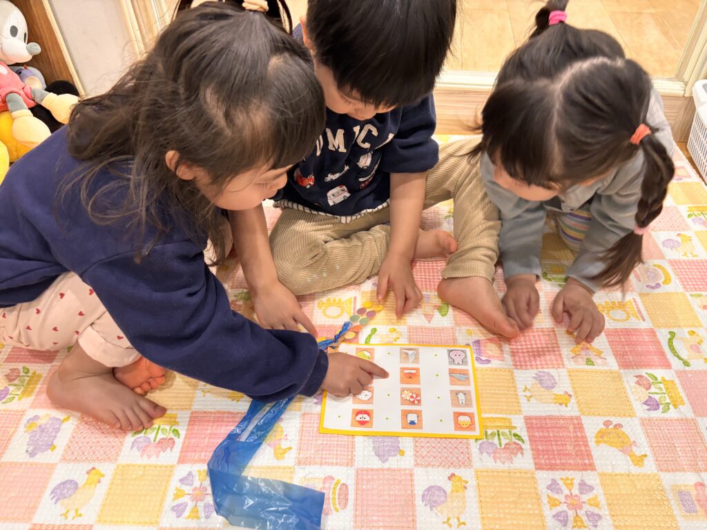 見つけると「あったー!!!」と大喜び!見つけたものはしっかりシールを貼り「できたよー!」「見つけたよー!」と教えてくれました😊また、見つけられない子には「ここだよー」と教えてあげていました。