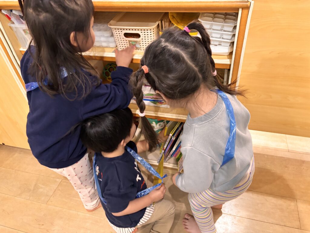 頑張って探してもなかなか見つからず、、、。考えた末、おもちゃ棚の中をのぞいたり絵本を動かして探したりとしていました。