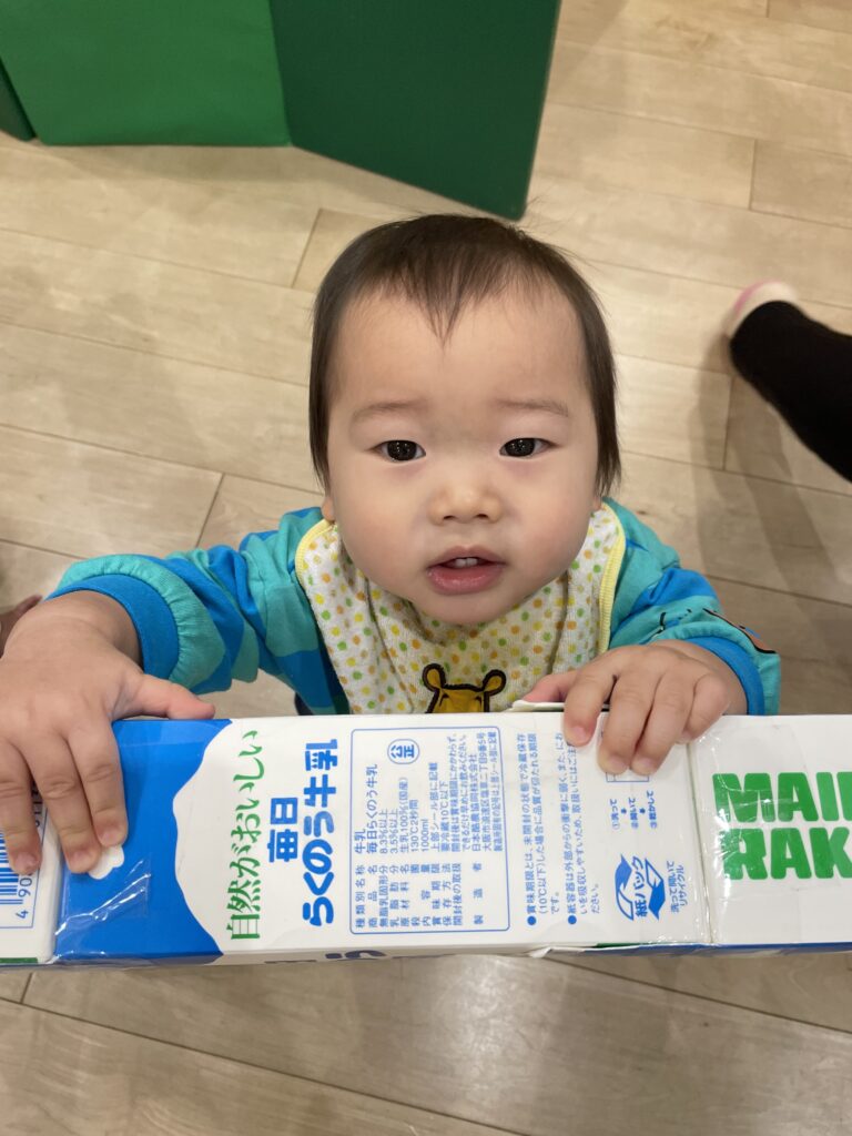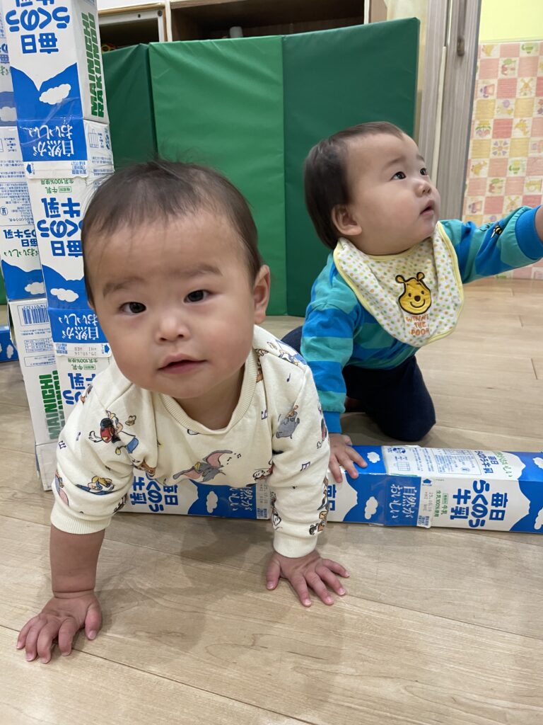 ひよこ組さんは、牛乳パックで作られたトンネルをくぐって遊んでいました。