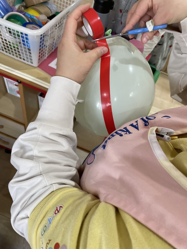先生達が次から次へとアイデアを出して、子ども達が楽しめるようにいつも工夫しています。風船を飛ばして遊んだり、ビニールテープを風船の周りに貼ると風船がボールみたいになって、キックができるようになったり天井にぶら下げて子ども達がジャンプして風船にタッチしてみたりと🎈室内でも身体いっぱい動かして遊びました。