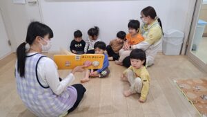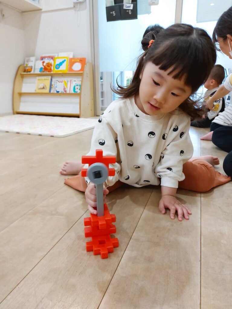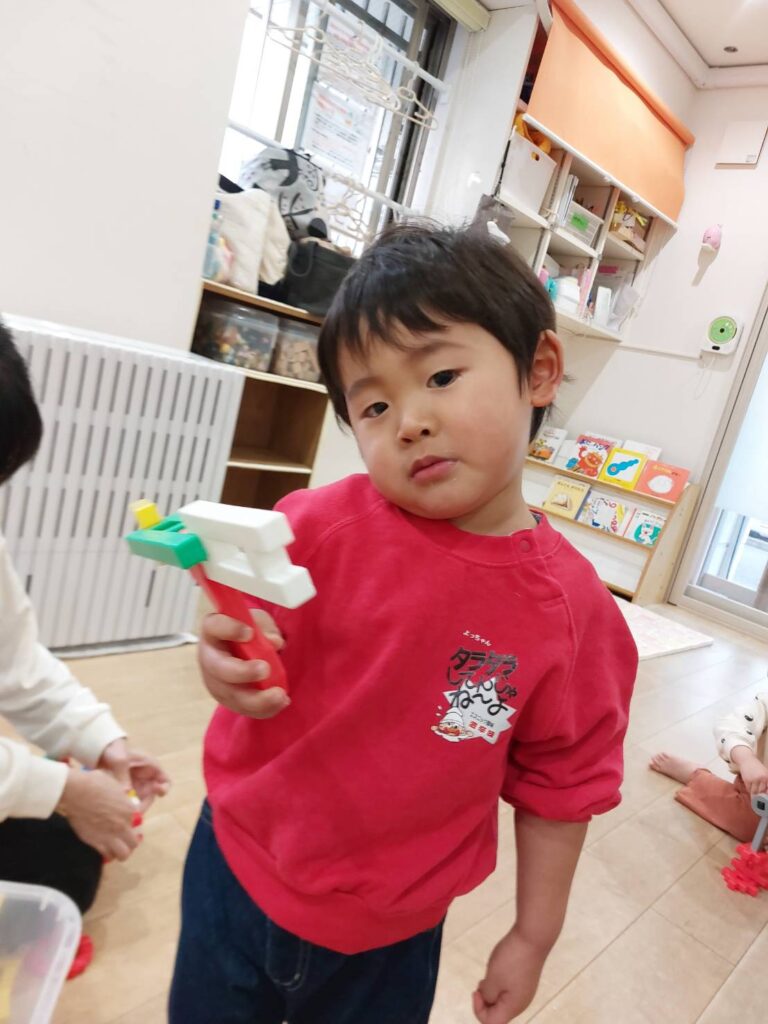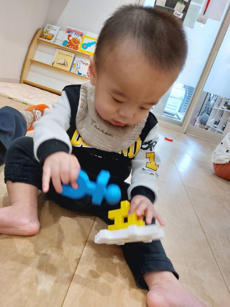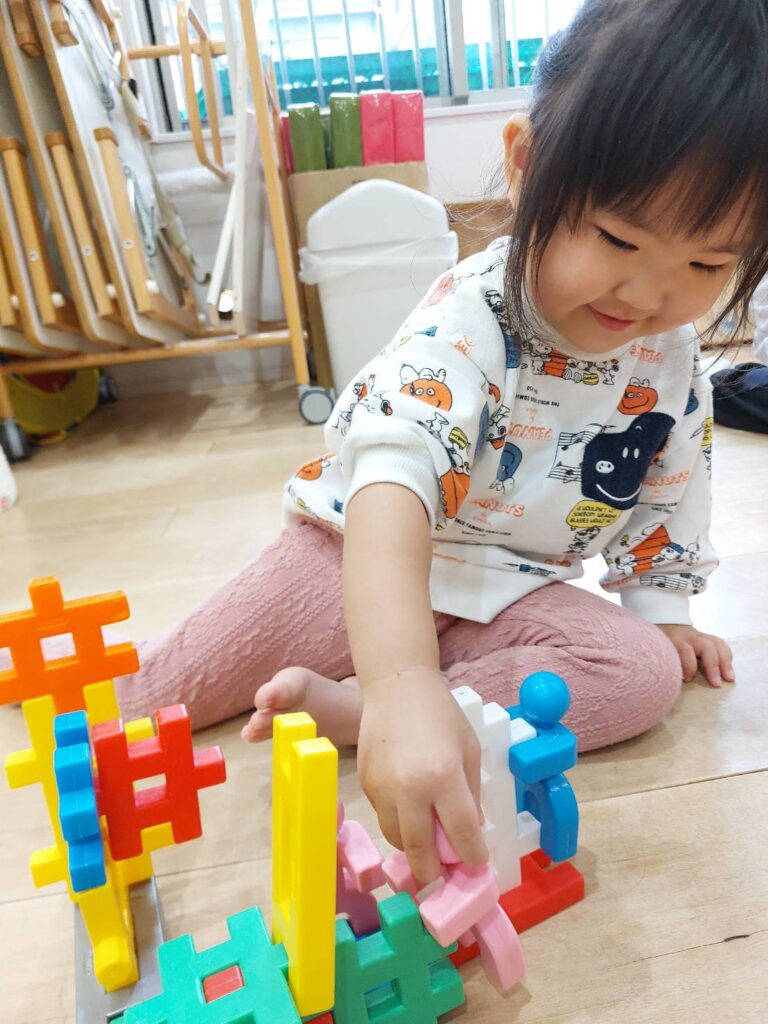 ひよこぐみのお友だちは、ブロックを持って感触を楽しんだり、振ってみたり、どうやって組み合わせようかな?と試行錯誤を重ねていました。