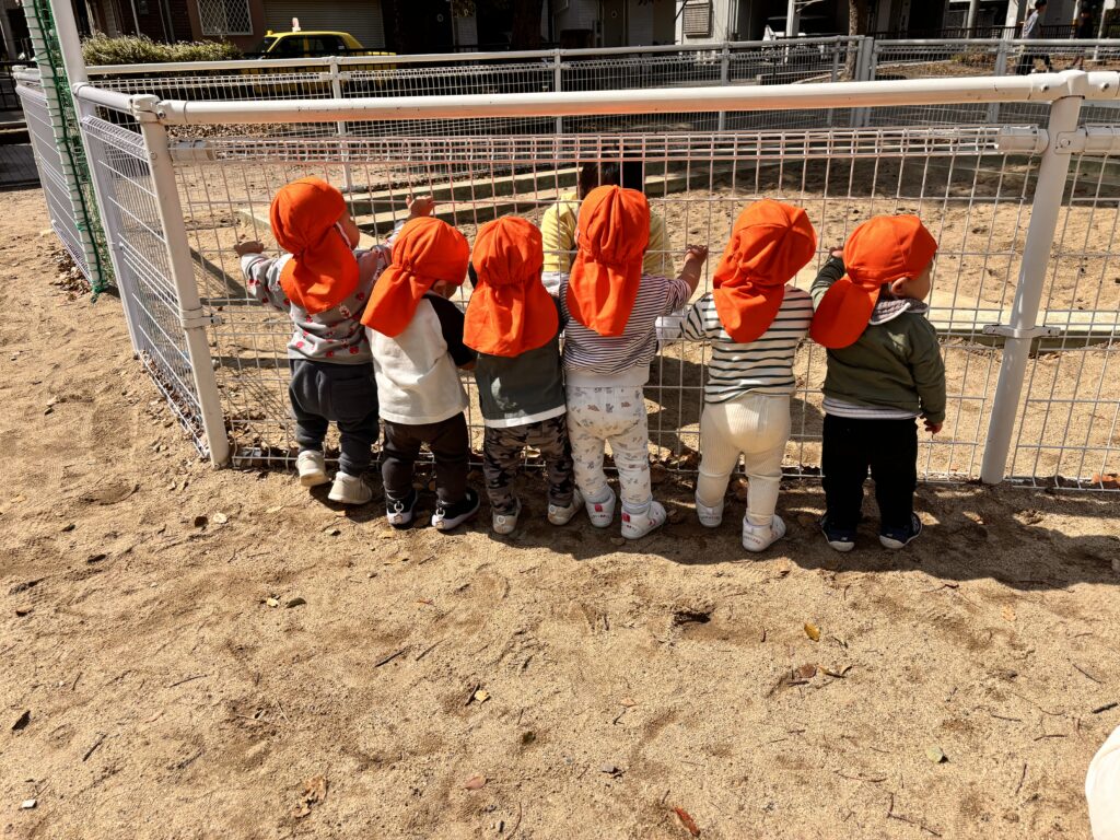 ひよこ組は、歩ける子やまだ練習中の子といますが、みんなで集まって柵を握りつかまり立ちをしていました。後ろ姿から可愛い雰囲気が溢れていました(˶'ᵕ'˶ )︎