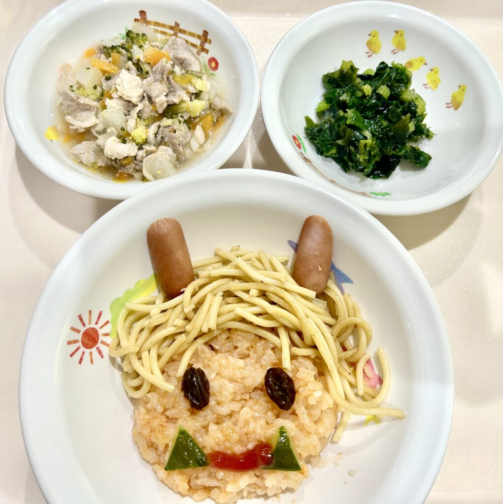 赤おにさんライス/豚肉と野菜のコンソメ煮/小松菜とワカメのナムル風