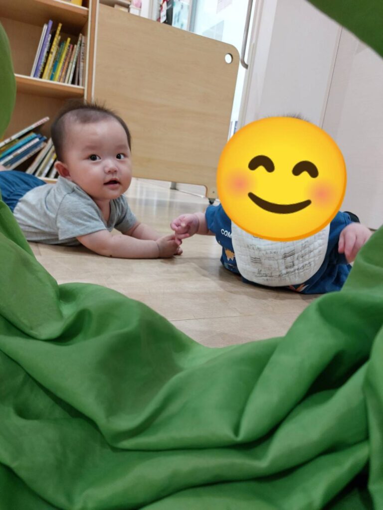 トンネル遊びでは、反対側から声かけするとジーと眺めていました。