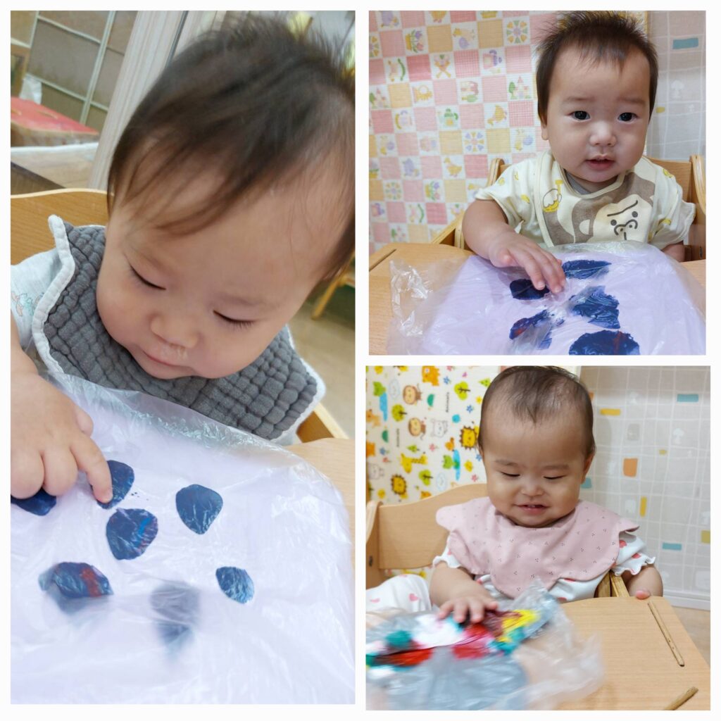 製作では、ビニールの上から絵の具に触れて感触を楽しみました。