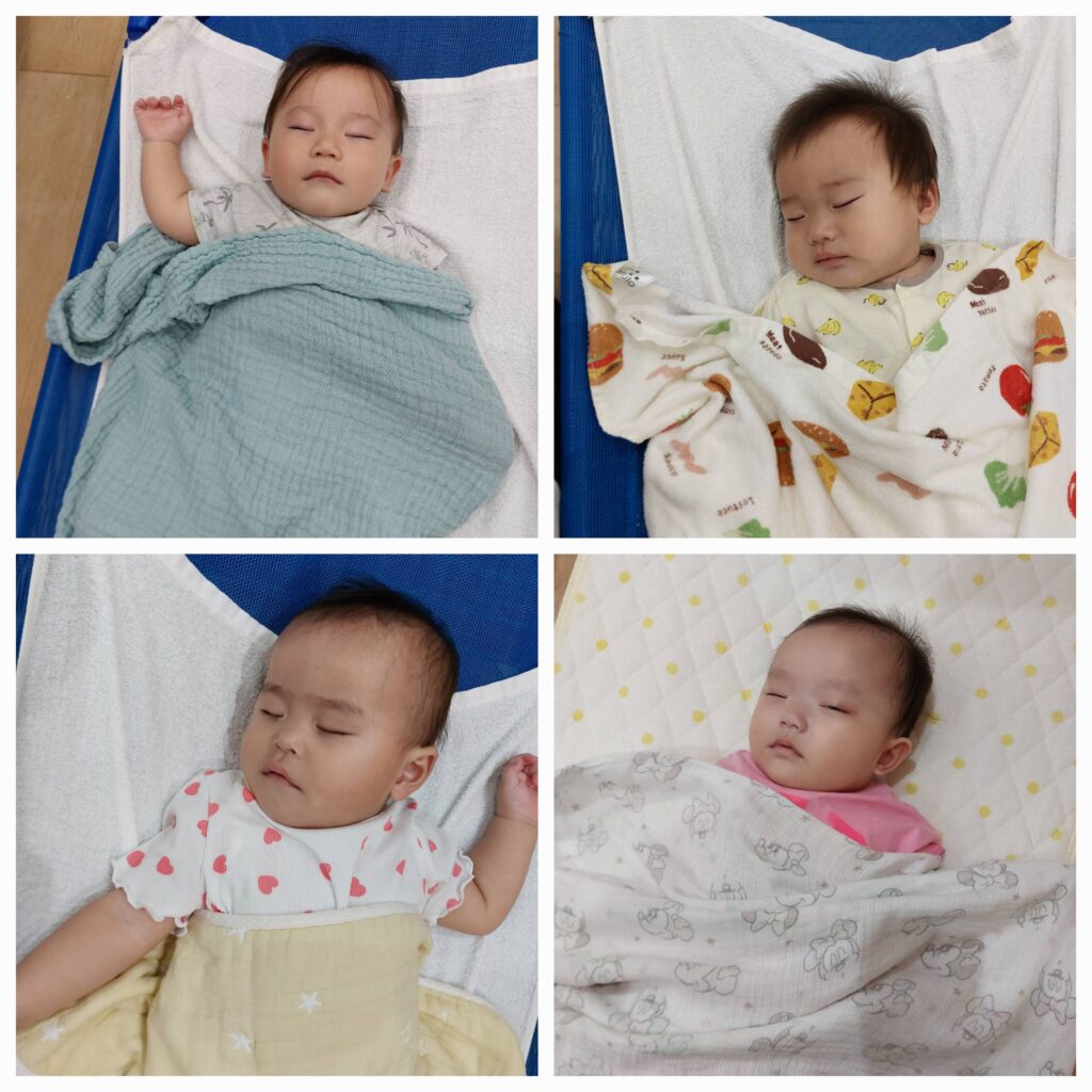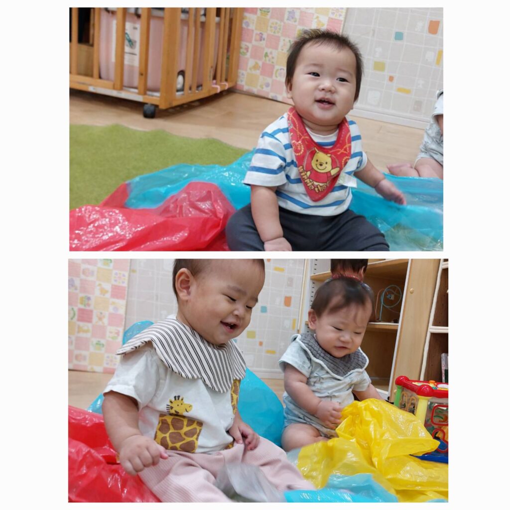 パラバルーンでは、ふわふわ上下する布をキラキラした目で嬉しそうに見たり、布の上に座って全身で感触を楽しんでいました。