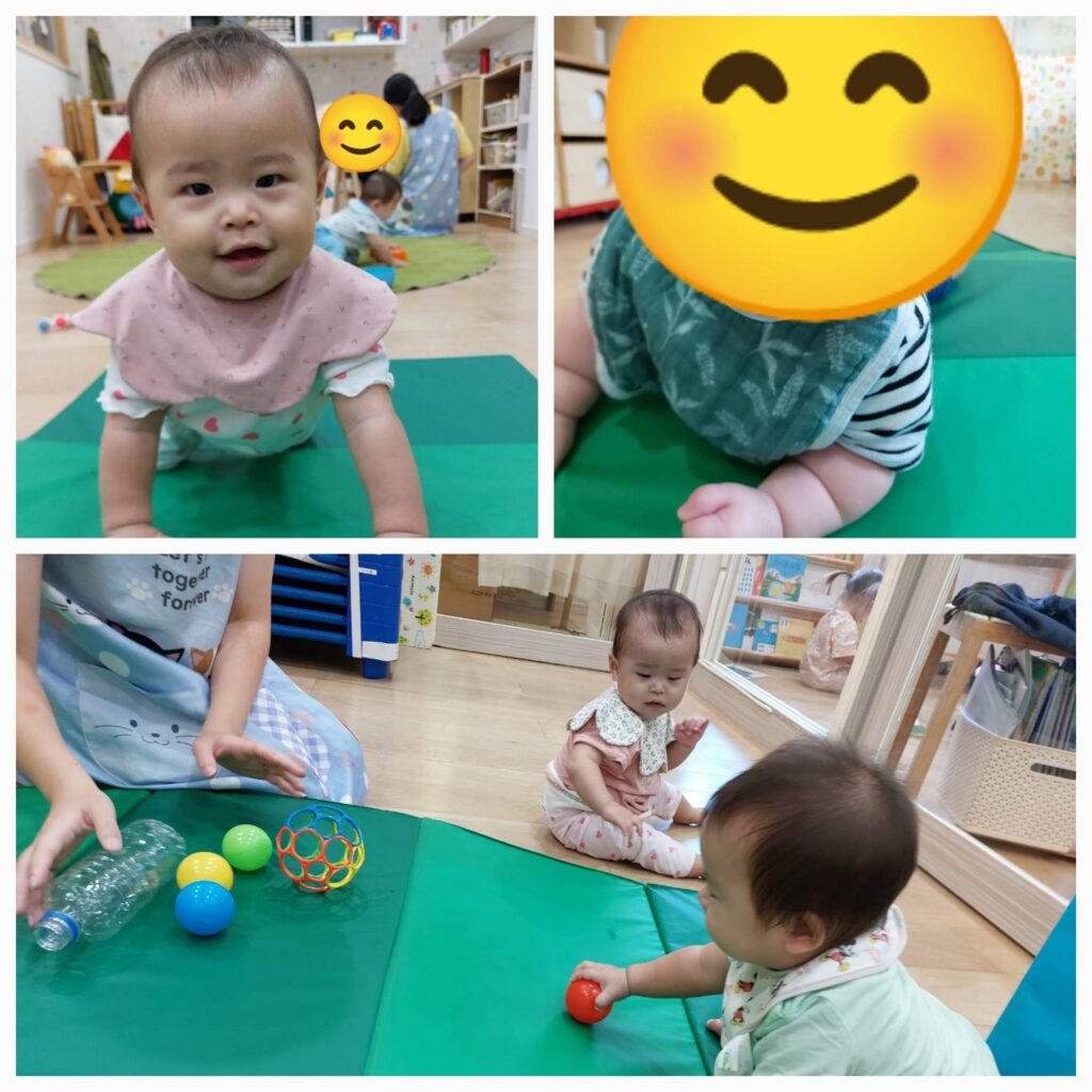 マットの山登りでは、ハイハイやずりばいでよいしょ!よいしょ!と全身を使って登り下りを楽しんだり、山から色々な物を転がして見て楽しんだり、転がった物を追いかけたりして楽しみました。