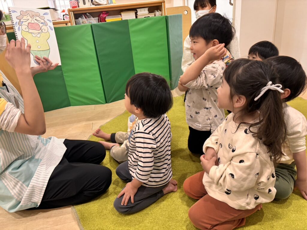 スケッチブックシアター「心の鬼」をみると「泣いてるー!」「えんえんしてる!」と伝えてくれる子ども達や