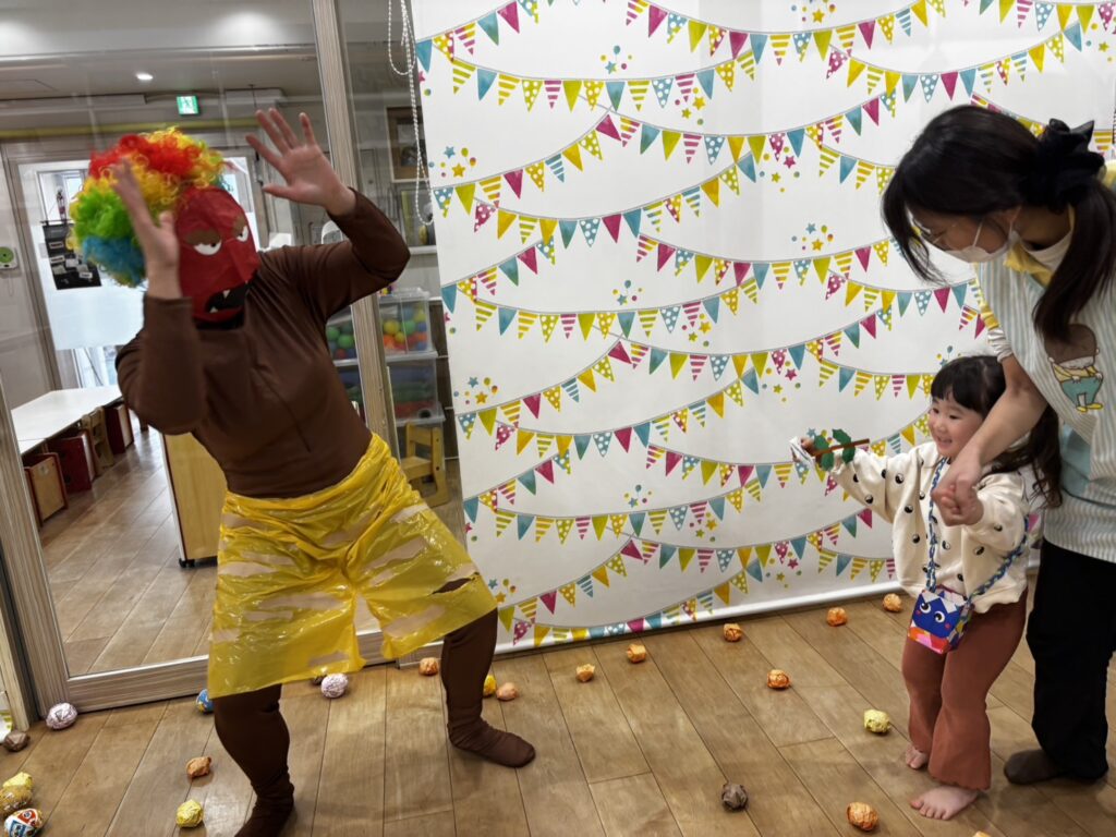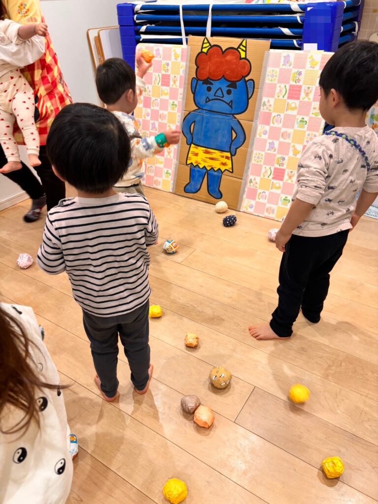 鬼の絵に「鬼は外!」「福は内!」と言いながら豆を沢山投げていた子ども達🧒👦