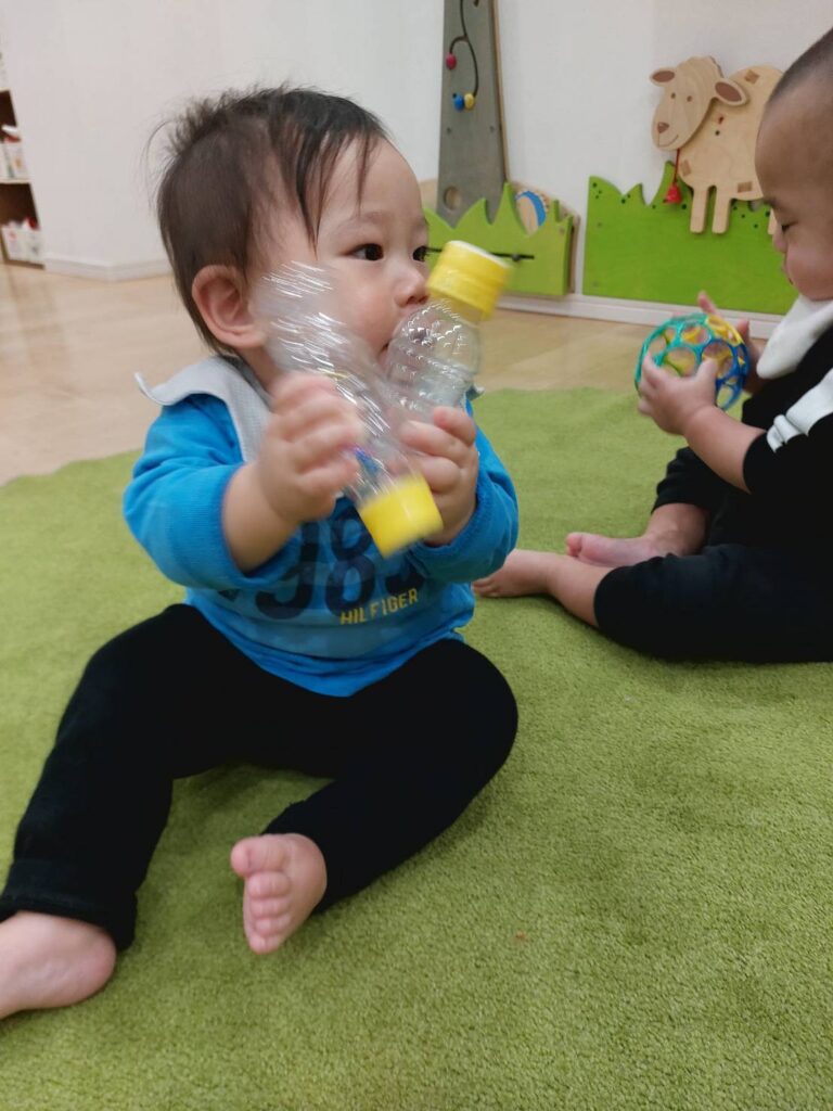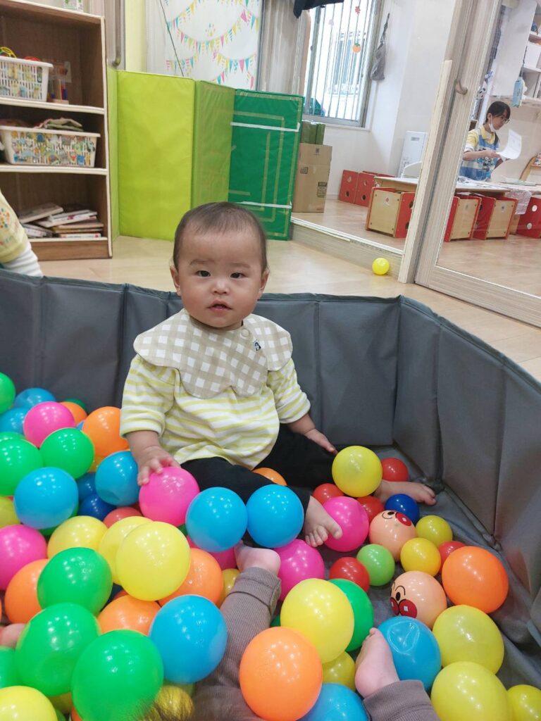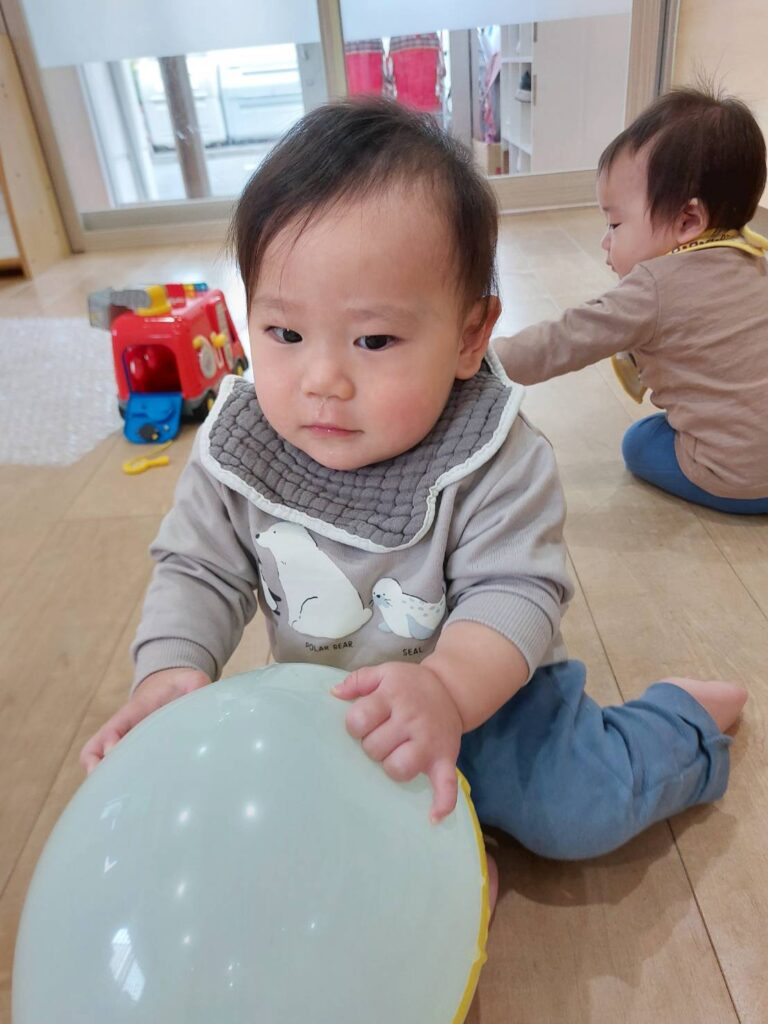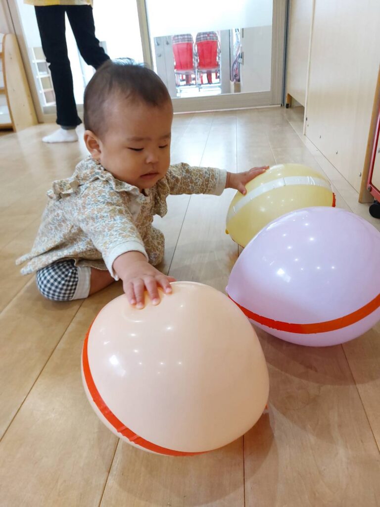 風船にビニールテープを貼り付けることで割れにくくなり、ギューっとしてしまうひよこぐみのお友だちでも安心して風船遊びを楽しんでいます。