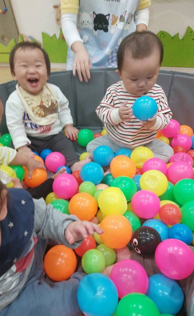 「うーん」どの色にしようかな?と聞こえてきそうなぐらいボール見ている姿が愛らしいです。