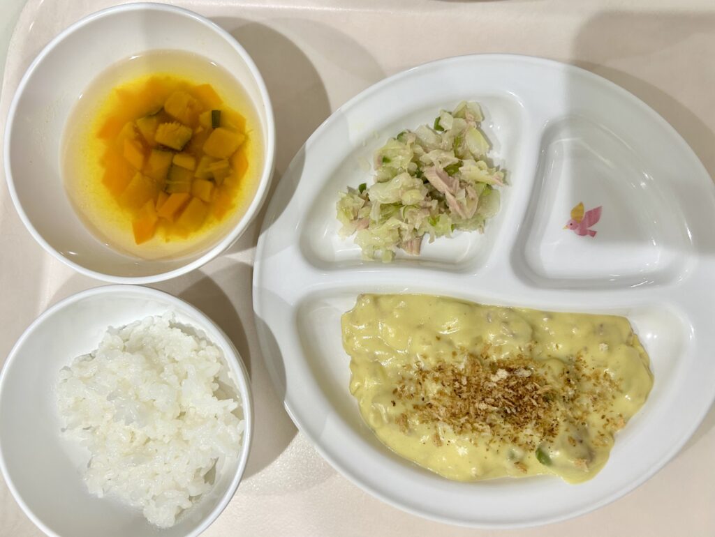 ご飯/豚肉のコーンクリーム焼き/キャベツのツナサラダ/スープ