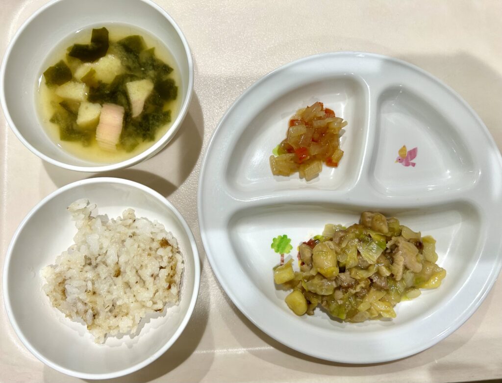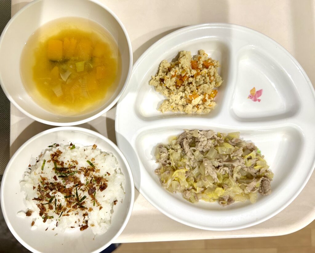 ふりかけご飯/豚肉と白菜の炒め物/炒り粉豆腐/みそ汁