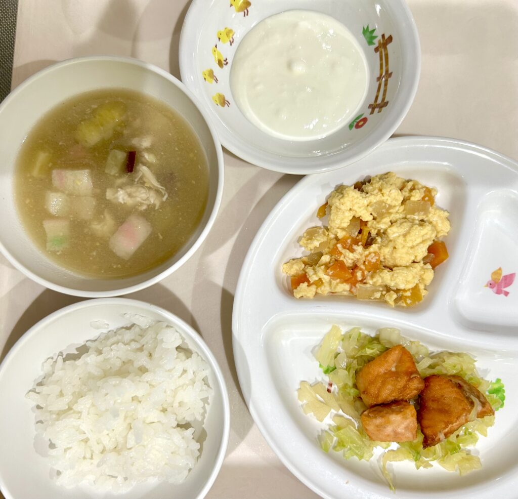ご飯/鮭の竜田焼き/大根の玉子とじ/鶏汁/ヨーグルト