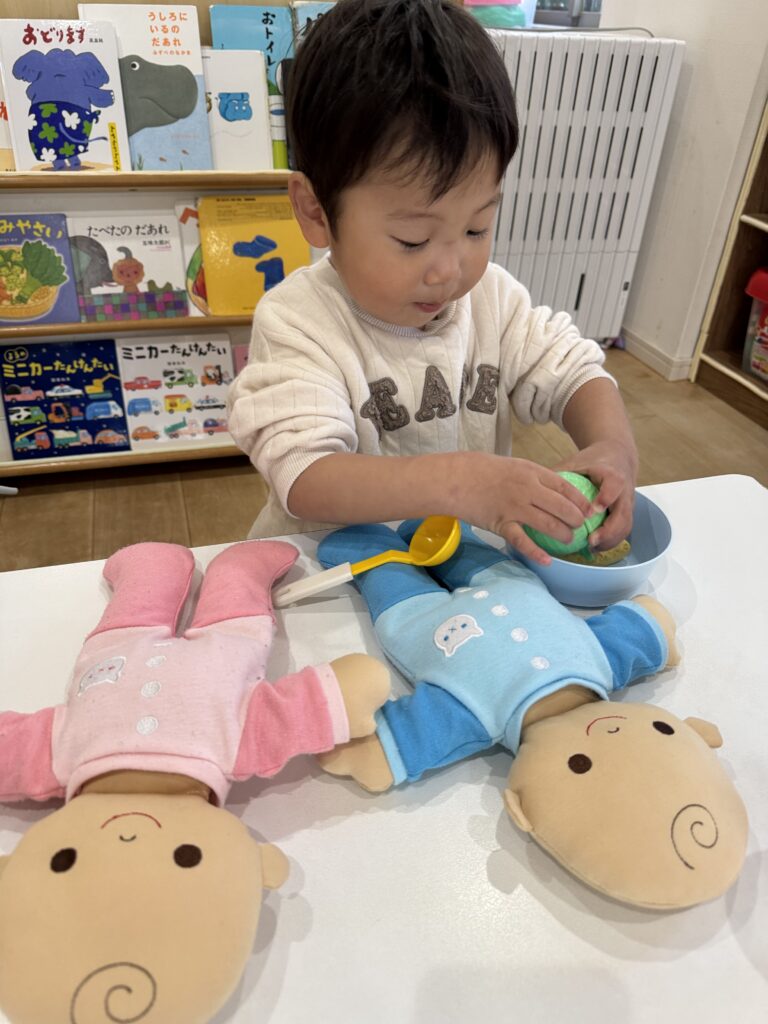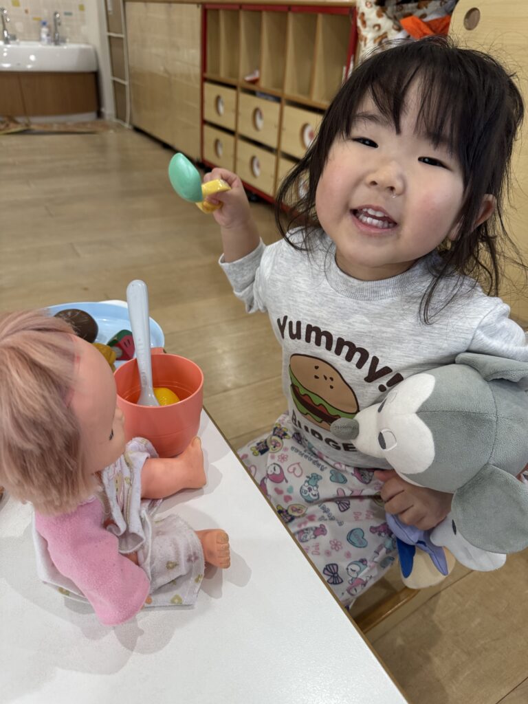 メルちゃんや赤ちゃんに「美味しいねぇ」とご飯を食べさせてあげ、お世話をしている子や